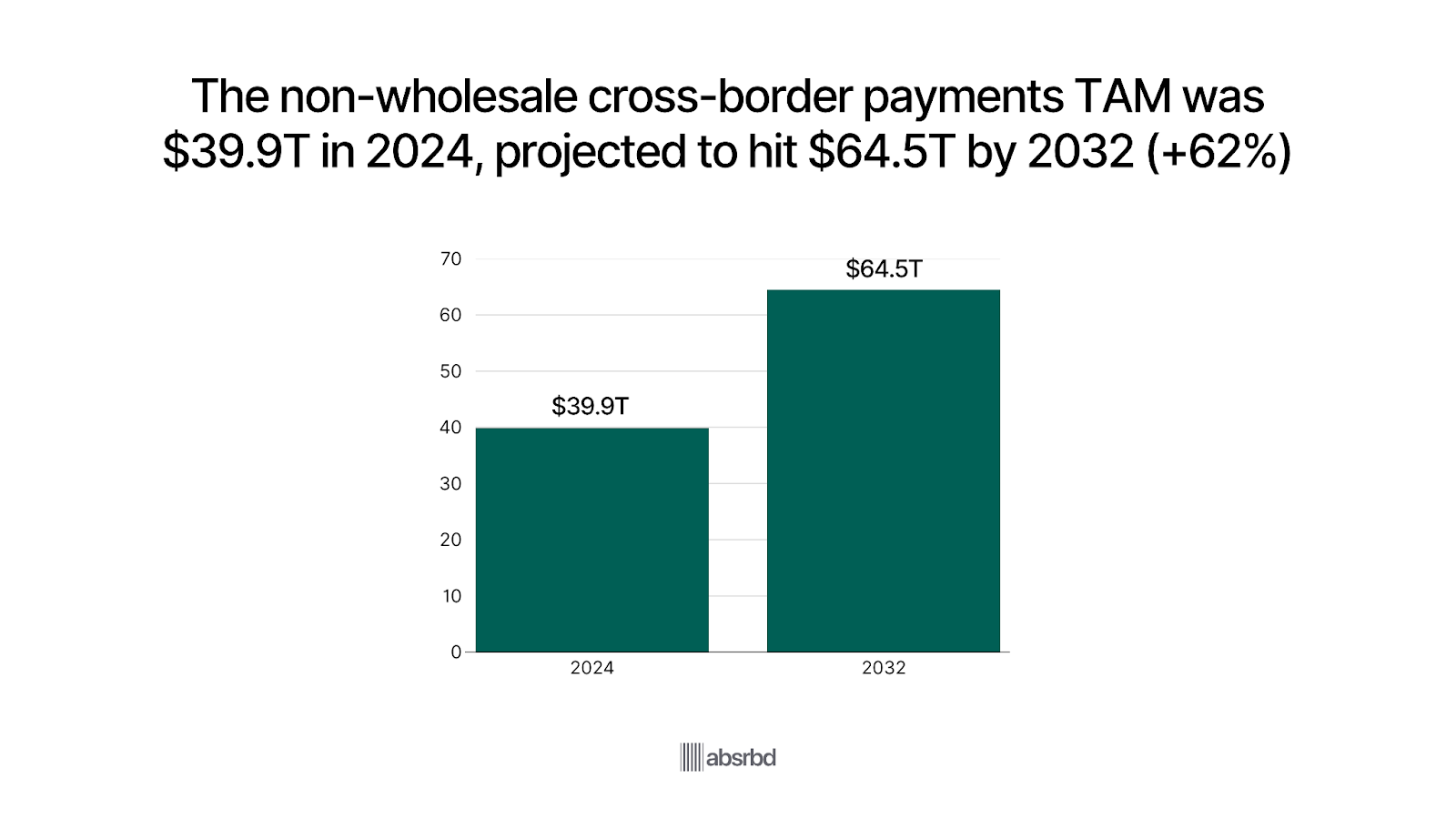 - The non-wholesale cross-border payments TAM will expand 62%, from USD 39.9 trillion in 2024 to USD 64.5 trillion by 2032.