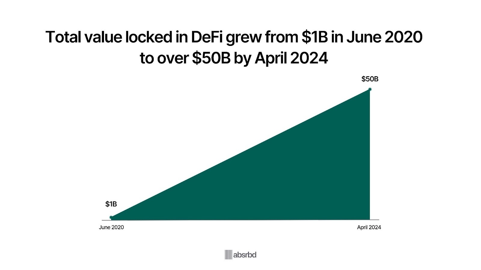 According to DeFi Pulse, the total value locked in DeFi protocols grew from about $1 billion in June 2020 to over $50 billion by April 2024. Exploding topics