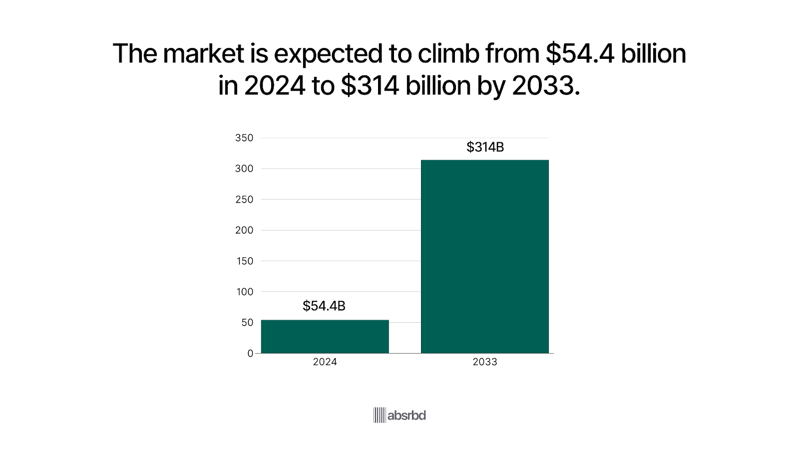 - A different source places the global market at USD 54.44 billion in 2024, with growth to USD 314.13 billion by 2033, assuming a CAGR of 21.5% from 2025-2033. Market Data Forecast