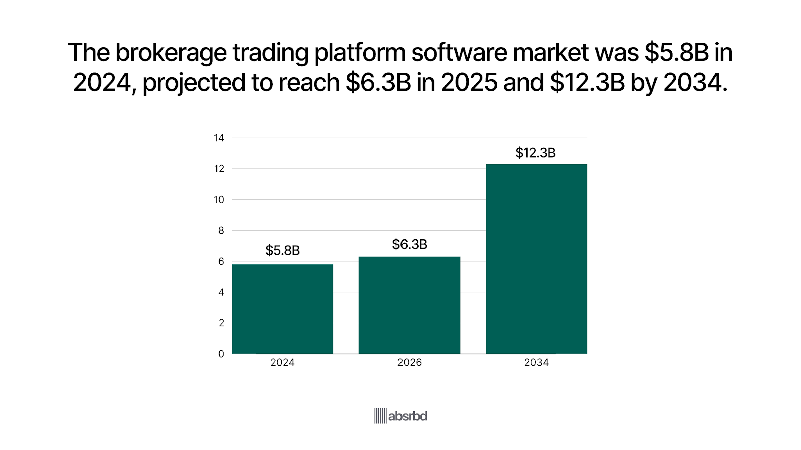 - The brokerage trading platforms software market software toolset was worth USD 5.80 billion in 2024 and is projected to hit USD 6.29 billion in 2025, reaching USD 12.30 billion by 2034.